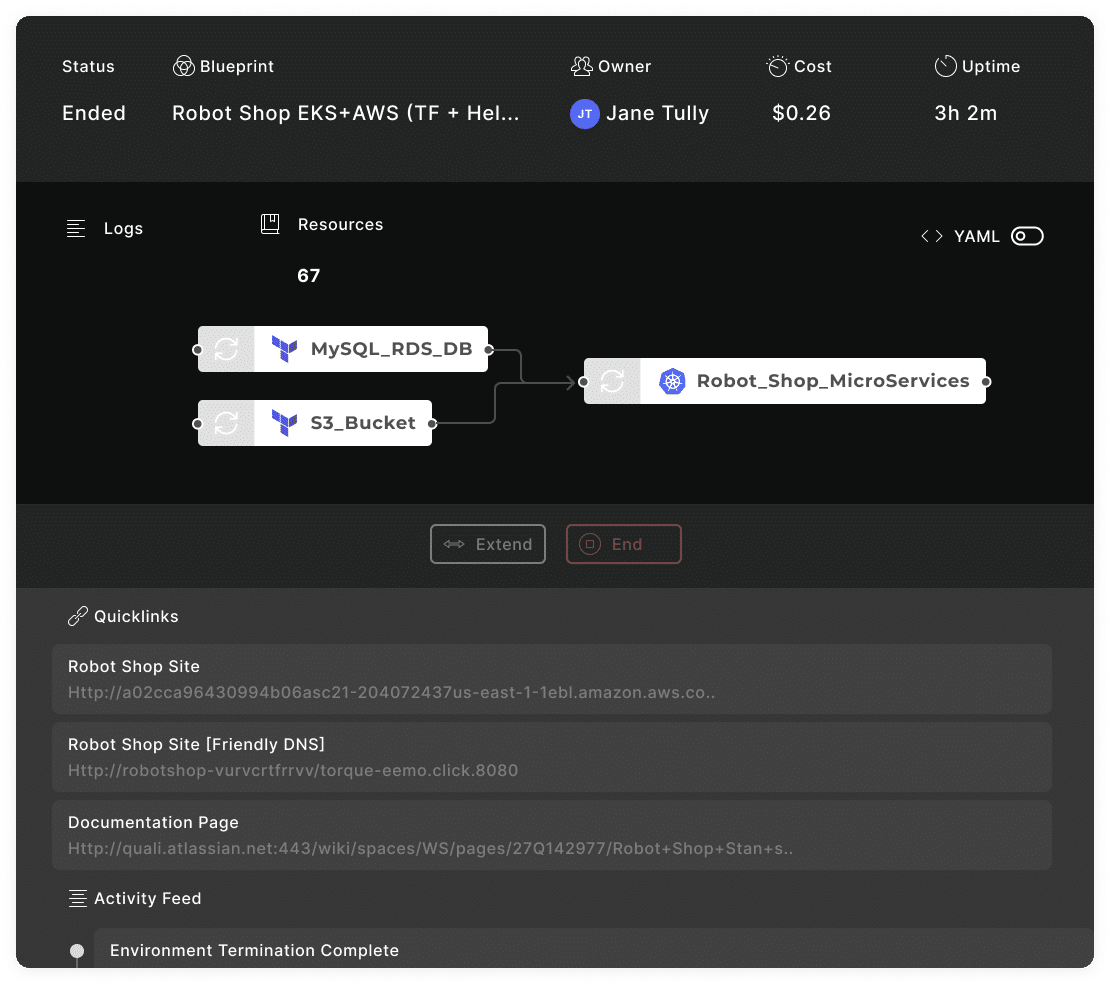 No need to train your teams on a new coding language or create new cloud configurations. Quali Torque connects to GitHub, GitLab, Bitbucket, and other repository types to automatically discover and import all the assets your teams use today–including support for Terraform, AWS CloudFormation, Helm, and Kubernetes.