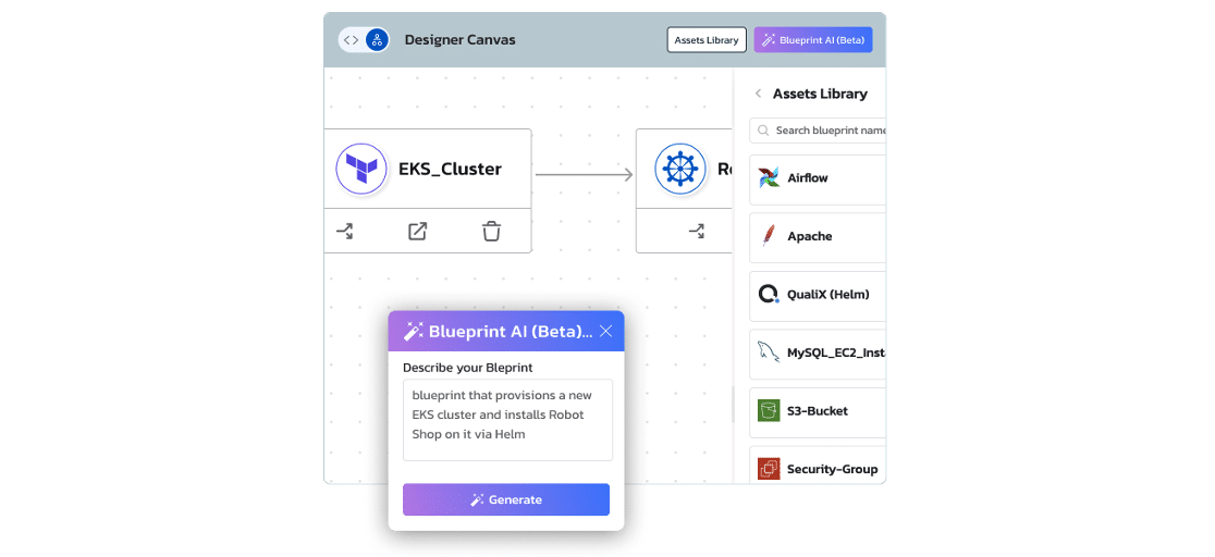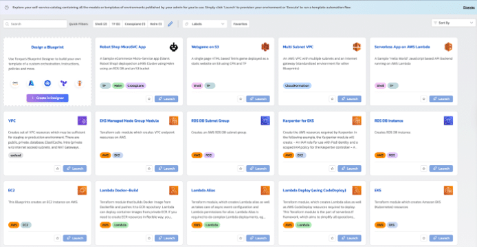 - Limit the initial scope: For example, in Torque, you can start by using a single tool, say Terraform, and select only a handful of modules that you want to expose through the agentic AI platform. Based on these modules, use the built-in Copilot to create different blueprints. Next, have a small group of engineers come in and test the provisioning of new environments from Torque’s service catalog, rather than using Terraform commands. This will get you feedback on what’s working and what needs improvement. You can easily show quick wins to your stakeholders while creating internal champions who can advocate for broader adoption of the platform.