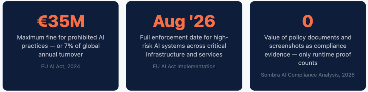 For organisations that believe this is a future concern, the timeline demands immediate attention. The EU AI Act’s full enforcement provisions for high-risk AI systems, which explicitly includes AI operating in critical infrastructure, essential services, and regulated environments, take effect on August 2, 2026. The penalties are not advisory.