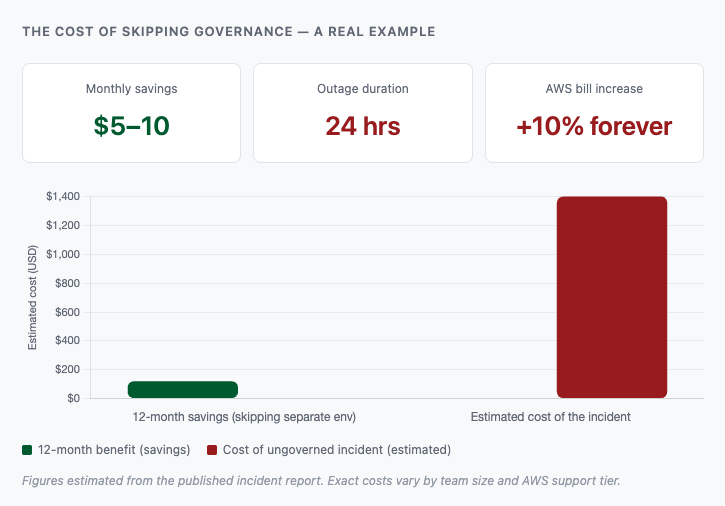 This is the pattern behind real incidents, including the case we examined in depth where an experienced engineer, using a capable AI agent, lost 2.5 years of production data because the governance layer simply wasn’t there. It’s not a skill problem. It’s a systems problem.