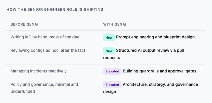 The role of senior infrastructure engineers isn’t shrinking in the age of GenAI. It’s shifting, toward higher-leverage work that AI genuinely can’t do.