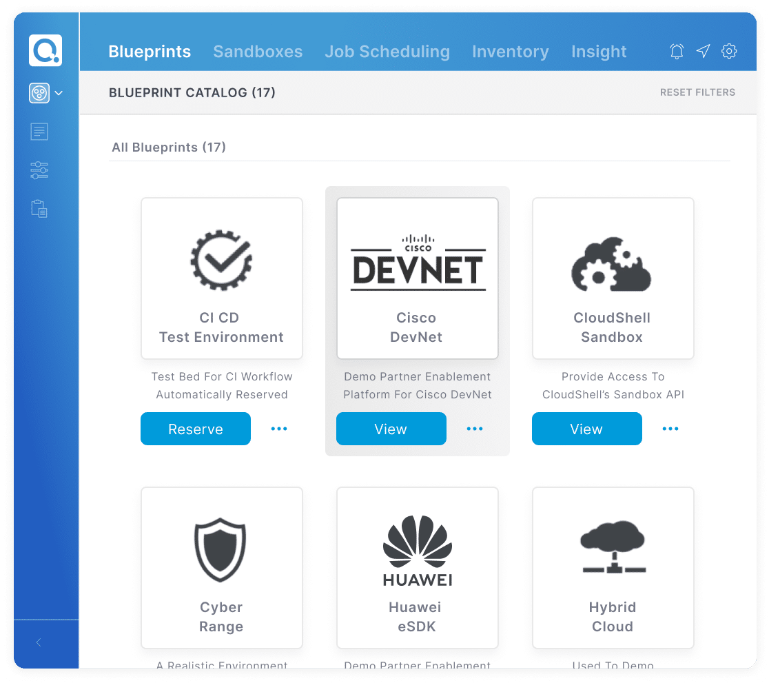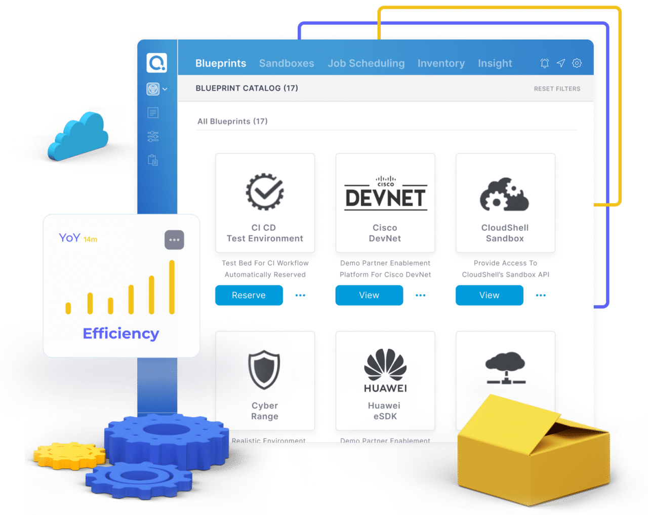Accelerate how you orchestrate across cloud and on-premises infrastructure. Quali CloudShell defines configurations of all your infrastructure assets as reusable low-code and no-code assets that you can drag-and-drop to orchestrate complete environments. Once orchestrated, your environments can be reused and updated so you never have to build them again.